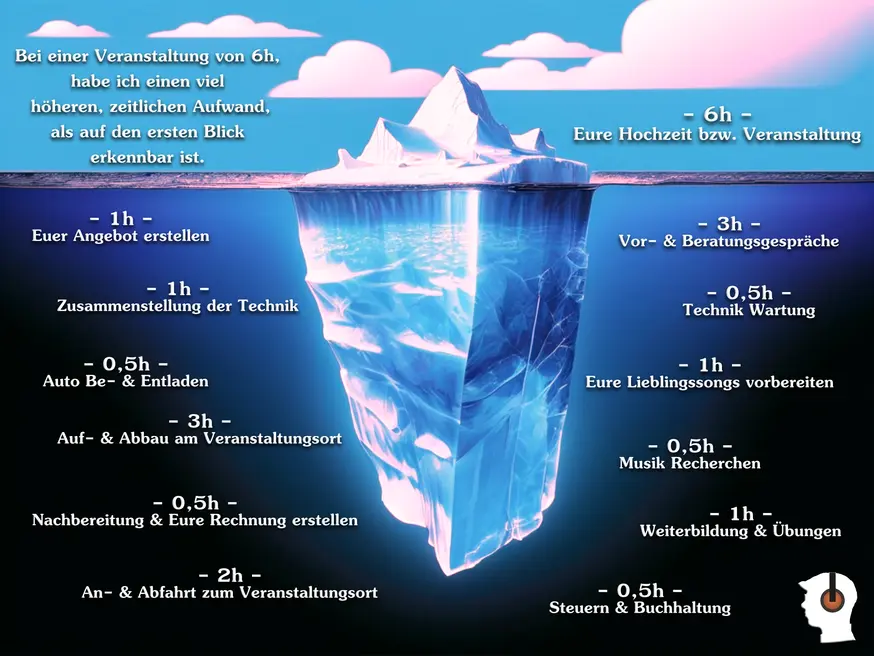 Hinzu kommen natürlich noch die Aufwände, die jeder Selbständige hat und der gesamte Part, überhaupt als DJ arbeiten zu können, wie tausende von Songs auszusuchen und zu kaufen, Technik zu beschaffen, Licht zu programmieren, Werbung zu machen, die Homepage zu bearbeiten, auf Messen zu gehen und sich weiterzubilden. :-)